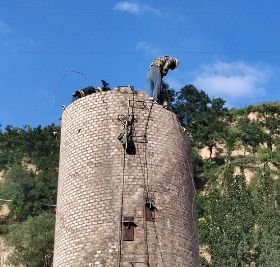 磚煙囪,國(guó)標(biāo)圖集中最高的磚煙囪,拆除難度大。此次拆除的磚煙囪沒有場(chǎng)地,只能人工拆除,雖然進(jìn)度慢,但是確保了施工安全。