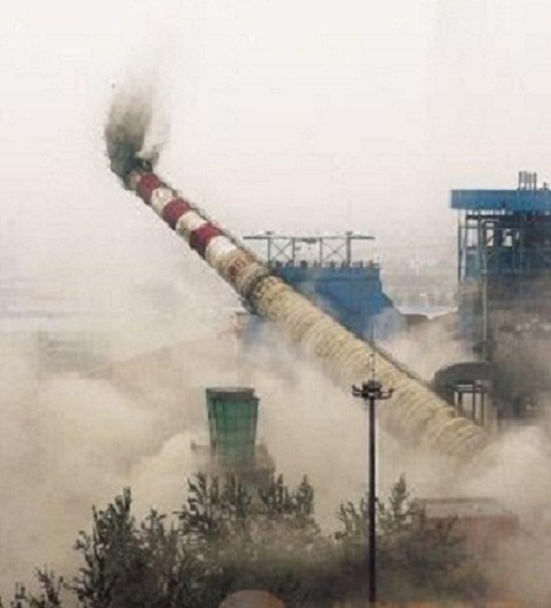 7月5日,邢臺市實施了集中拆除煙囪行動,共拆除72根煙囪,爆破4座冷卻塔。圖為沙河市金秋玻璃廠高達61米的煙囪轟然倒下。  記者王永晨攝