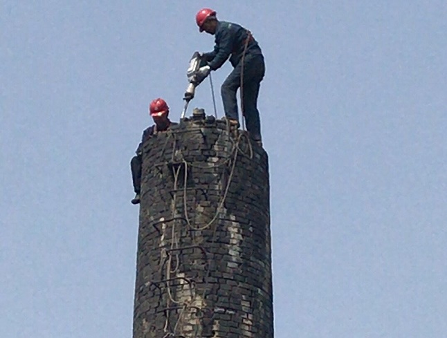 2、拆除煙囪時要盡量減小粉塵的影響,人工拆除是采用電錘對煙囪自上而下粉碎性拆除,高空揚塵較大。