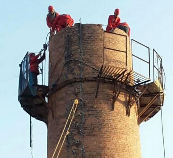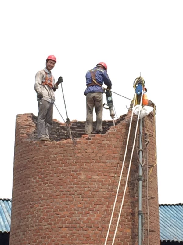 (1)煙囪正常完好,施工人員從煙囪外壁的鋼爬梯上進行登攀到煙囪頂部(第1次攀登煙囪鋼爬梯時、首先帶好安全保險帶、每個煙囪鋼爬梯都要進行試拉和搖動、確保煙囪鋼爬梯的承受力),施工人員把保險帶牢固的栓在煙囪鋼爬梯上(栓保險帶時、必須要栓2-3個牢固鋼爬梯上),保險帶確保牢固后,施工人員在煙囪頂部進行人工拆除煙囪。