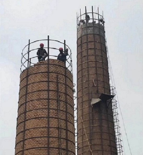 在煙囪頂口上橫放一塊木板、兩頭伸出煙囪各30公分以上,由于煙囪頂口和底部有誤差所有要以將誤差計算在內(nèi)。施工人員帶好保險帶、站在木板與煙囪墻壁上進行施工,用電鎬手錘進行拆除,拆除下來舊磚由煙囪外面掉下來,或者走煙道內(nèi)部清理。