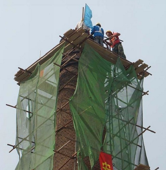 相對于砼煙囪人工拆除,磚煙囪人工拆除作業(yè)對施工人員的高空施工技能要求更高。砼煙囪人工拆除會在煙囪主體部分搭建升降環(huán)形腳手架。人員在腳手架上施工,安全系數(shù)很高。磚煙囪高度一般在30米至60米,這個高度搭建環(huán)形腳手架不但成本極高,而且很多環(huán)境根本無法搭建幾十米高度的腳手架。均是采用人工無腳手高空拆除作業(yè)。人員的安全,主要由固定在煙囪上的扒桿提供保障。安全施工主要靠人員的施工經(jīng)驗、以及高空施工心理素質(zhì)。