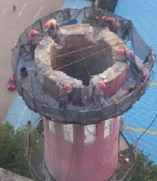 3、煙囪筒壁:在筒身內(nèi)部達(dá)設(shè)腳手架,施工人員在腳手架上工作,用空壓機(jī)打成小塊,在用氧氣割掉鋼筋。