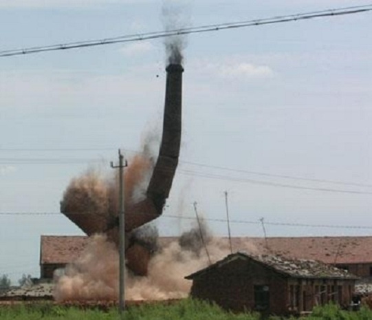 2、煙囪定向拆除方法:在煙囪底部先量好中心點,然后測算好開洞的寬度,接著就沿畫好的線開洞,邊開洞邊用厚木板或木棍頂住,預(yù)防煙囪隨時有倒下的危險,待洞開到足夠位置的時候,就用火把把木板點燃,這樣等木板燃燒到一定程度后煙囪就會自動按定好的方向傾倒了?! ?/p>