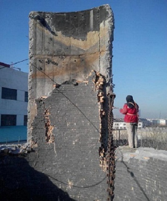 3.煙囪壁:腳手架設(shè)置在桶外。 施工人員在腳手架下工作。 空氣壓縮機(jī)用于打敗大塊,鋼被氧氣切斷。