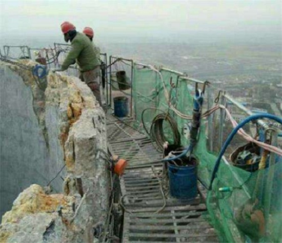 在操作平臺(tái)的防護(hù)欄內(nèi)側(cè)懸掛綠色2000目/100cm2安全網(wǎng),該安全網(wǎng)具有一定的強(qiáng)度,既可以減輕揚(yáng)塵的影響,還能遮擋碎渣,避免碎渣直接高空落地帶來(lái)的安全隱患。