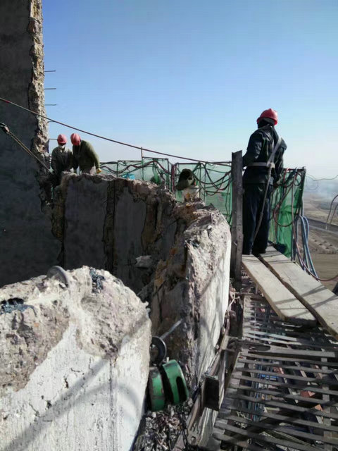 2、煙囪拆除施工作業(yè)人員采用懸掛吊籃進(jìn)行逐步向下切割拆除。