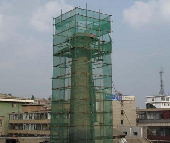 高30米磚煙囪全部人工拆除,不拆基礎(chǔ)。在拆塔前,先將地面以塔身為中心向外5米,用鋼管腳手架搭好6米高,在鋼管腳手架的外邊從上到下圍好安全網(wǎng),在從上到下圍上防護網(wǎng)使風(fēng)鎬打下的砼塊不得飛出安全網(wǎng)外(圍的密密實實,正如用罩子罩在煙囪上般),從而保護行人安全。