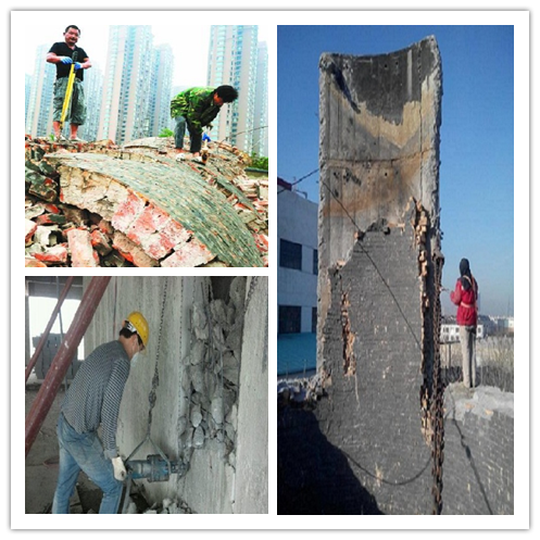 8、施工操作人員在身系安全帶的前提下施工,安全帶系牢在爬梯上,操作人員站在懸空腳手架上拆除。拆除工具使用電鎬、大錘、鑿子等工具,二人一組配合,以此類推往下拆除磚煙囪。拆除廢料,從空中直接落地。從高度拆除后,清理頂部,用水沖洗加高平面。