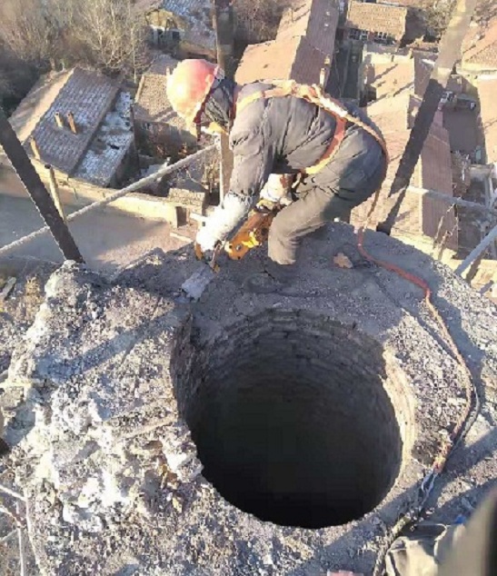 9、從50m高度拆除至40m高度后,要將水泥煙囪拆除的上部先進(jìn)行一下清灰工作,才可以進(jìn)行后面的加固施工。